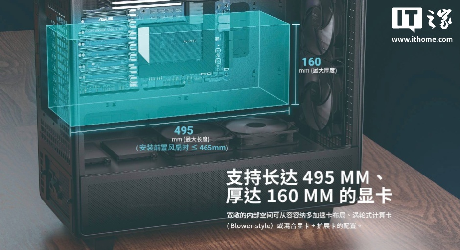 兼容性方面,该机 CPU 散热器限高 190mm,电源正常后装限长 230mm,侧装则是 170mm。机箱至多可安装 4 块 3.5 英寸硬盘 + 5 块 2.5 英寸硬盘。
