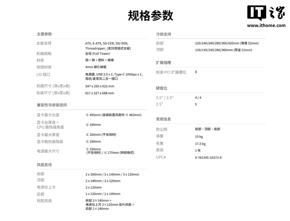 该机箱整体尺寸 547 x 250 x 622mm,重量 15Kg,支持 ATX、E-ATX、SSI-CEB、SSI-EBB 规格主板。机箱前、顶部提供磁吸防尘网,底部亦有全尺寸抽拉式防尘网。机箱顶置 2 个 USB-A 5Gbps 接口、1 个 USB-C 10Gbps 接口、1 个 3.5mm 音频接口。